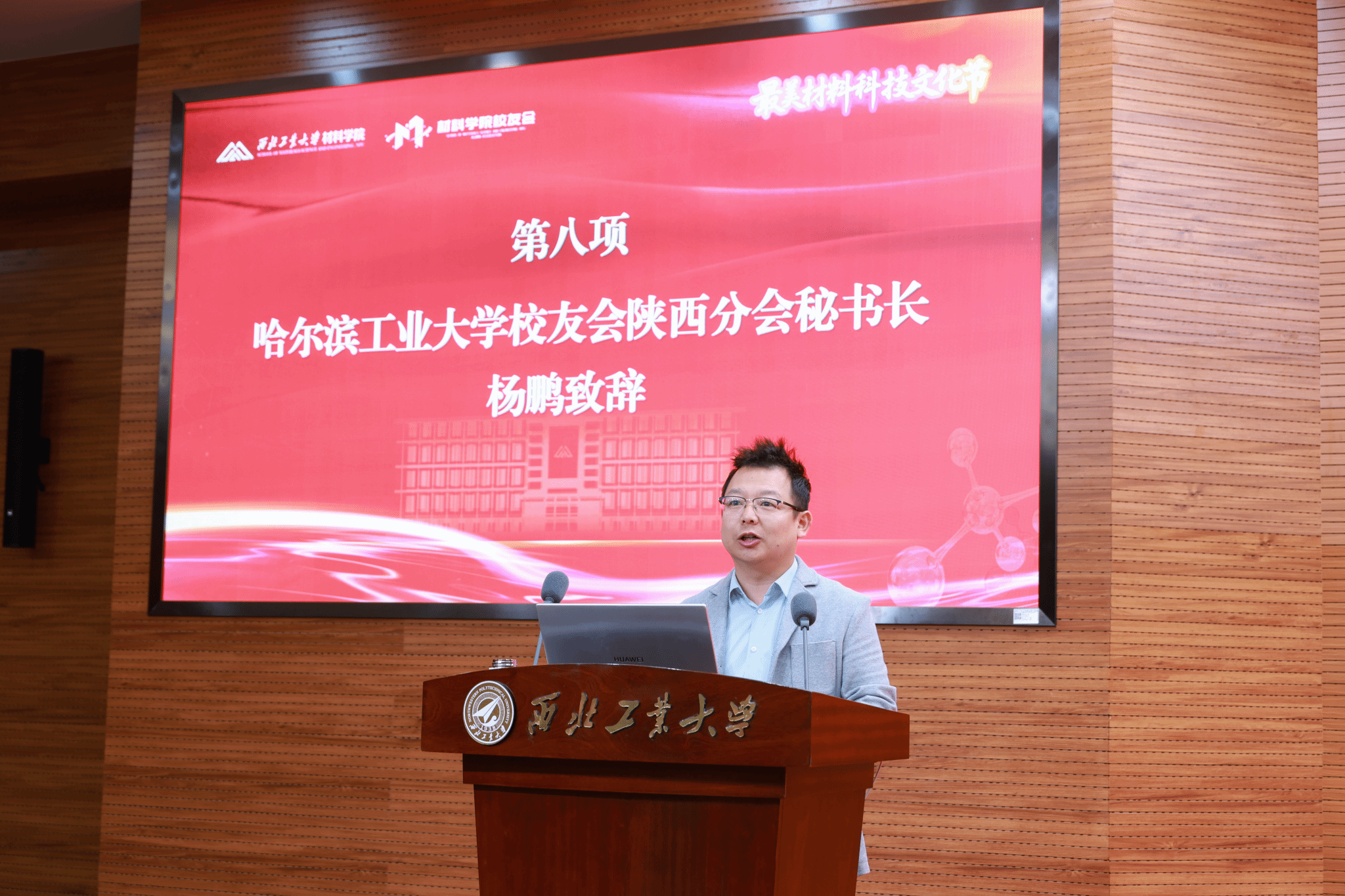 哈尔滨工业大学校友会陕西分会秘书长杨鹏代表兄弟校友会致辞。大会还收到了来自清华大学、上海交通大学等22所兄弟院校校友会及我校多地校友分会发来的贺信。
