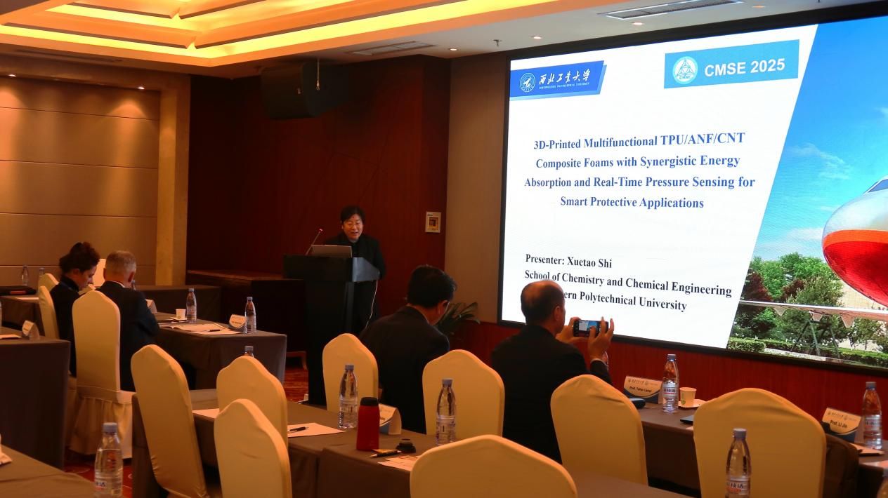 史学涛教授介绍了3D打印多功能TPU/ANF/CNT复合泡沫,其具有协同能量吸收和实时压力传感功能,可实现智能防护功能。
