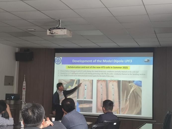 报告中,徐庆金从研究背景出发到关键科学问题再到研究成果分享,系统展现了在超导强磁场前沿领域的研究和应用。中国科学院高能物理所团队基于国产化高温及低温超导材料,研制出面向百TeV级高能量粒子加速器的高场超导实验磁体,磁感应强度超过14特斯拉,刷新高温超导二极磁场国际最高纪录。徐庆金表示为实现磁感应强度超过16特斯拉的超导磁体,高温超导失超探测及保护等是将来研究的核心挑战。